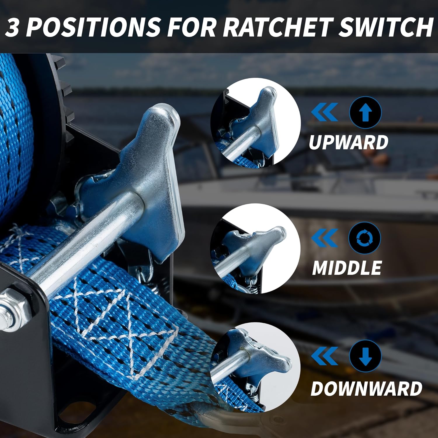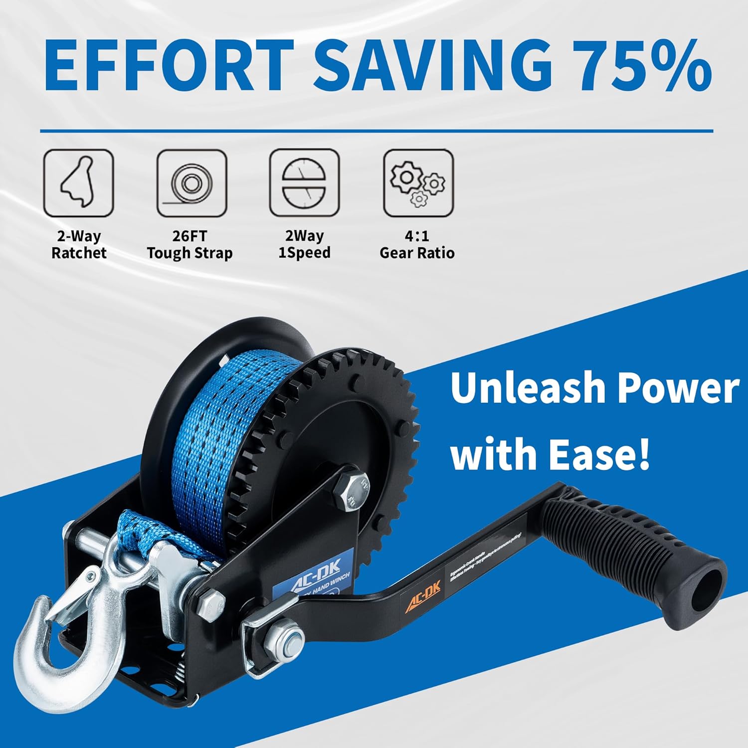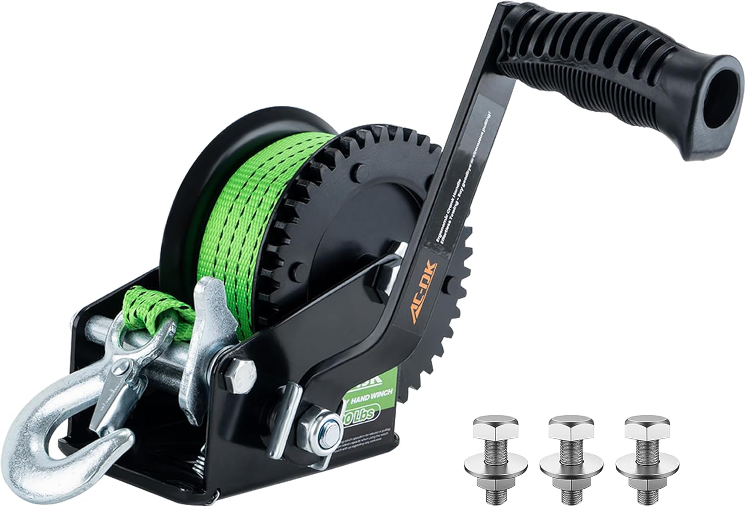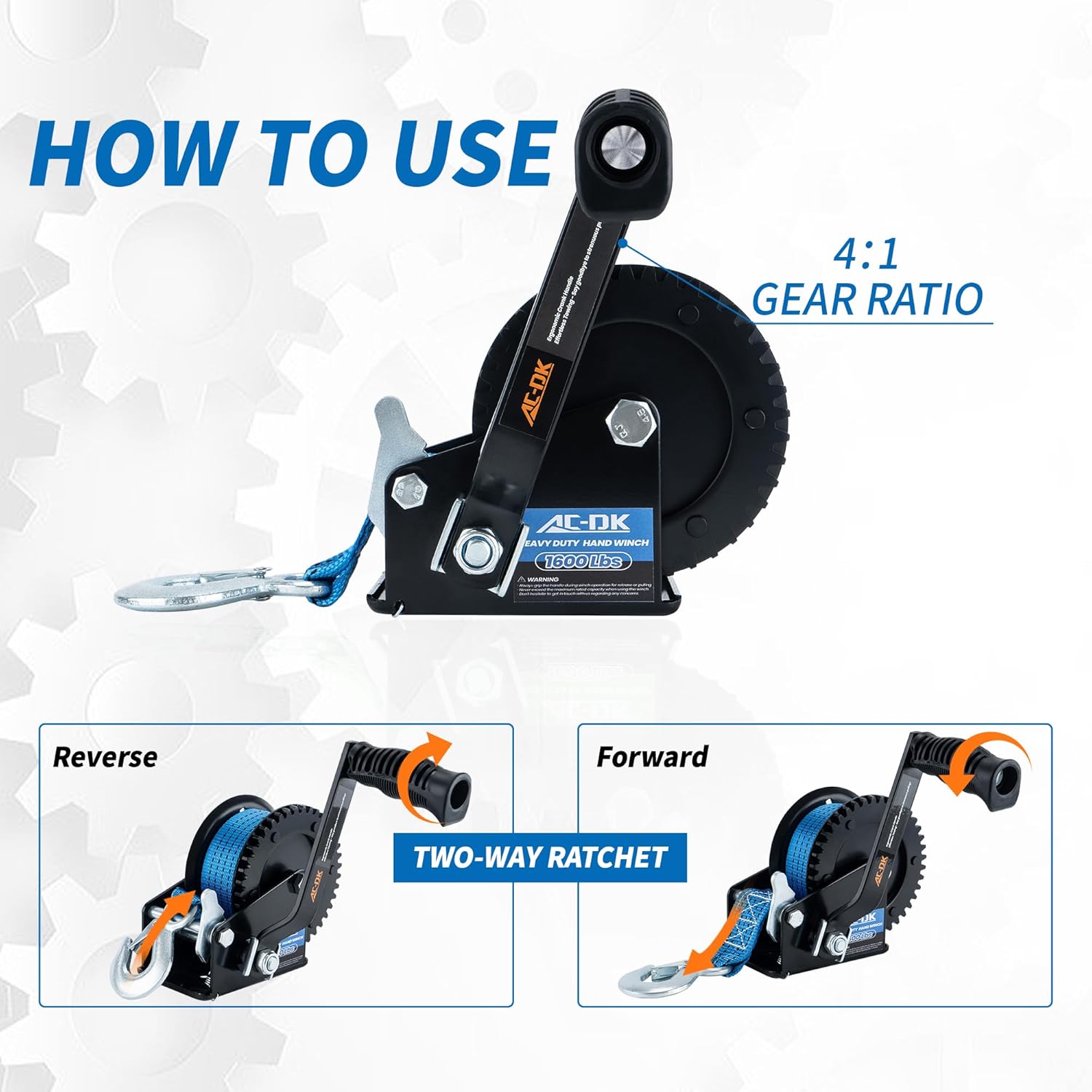 AC-DK 1600lbs Heavy Duty Boat Trailer Winch with 26FT Strap, 2-Way Ratchet & 4:1 Gear Trailer Winch, Portable Hand Crank Winch for Boat, Truck, Trailer, RV, ATV, Jet Ski