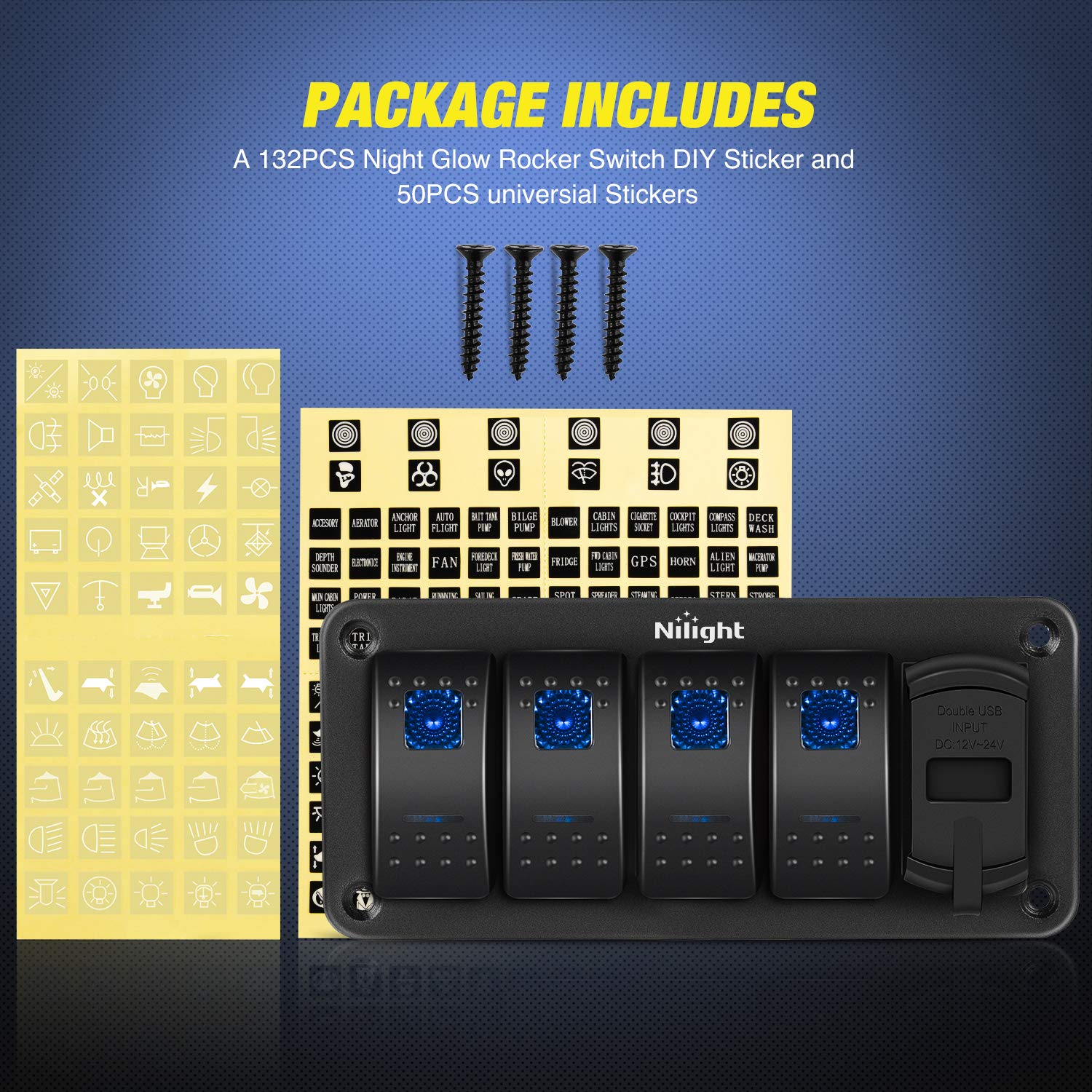 Nilight 4 Gang Rocker Switch Panel with 4.8 Amp Dual USB Charger Voltmeter Waterproof 12V 24V DC Night Glow Stickers for Car Trucks Boats RVs