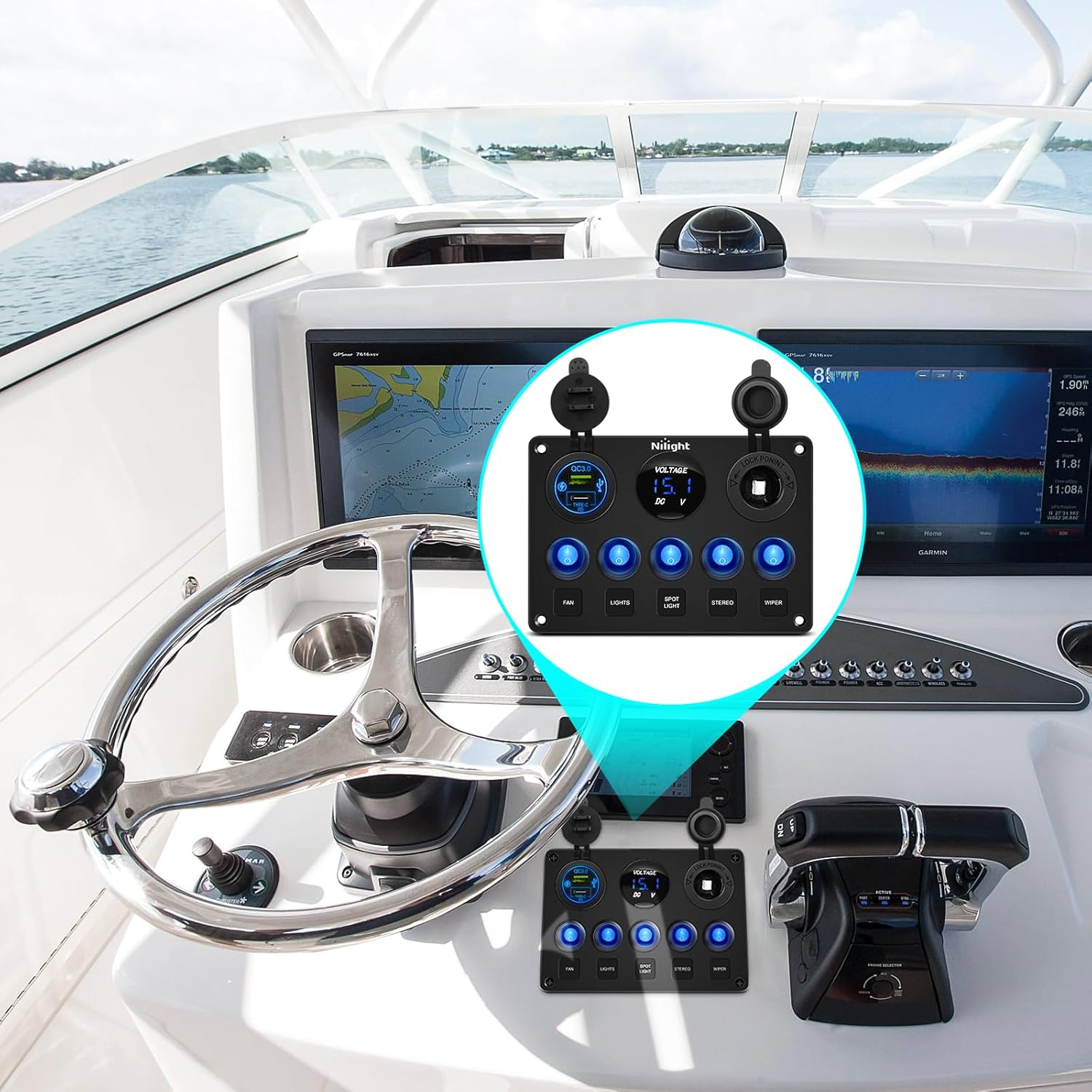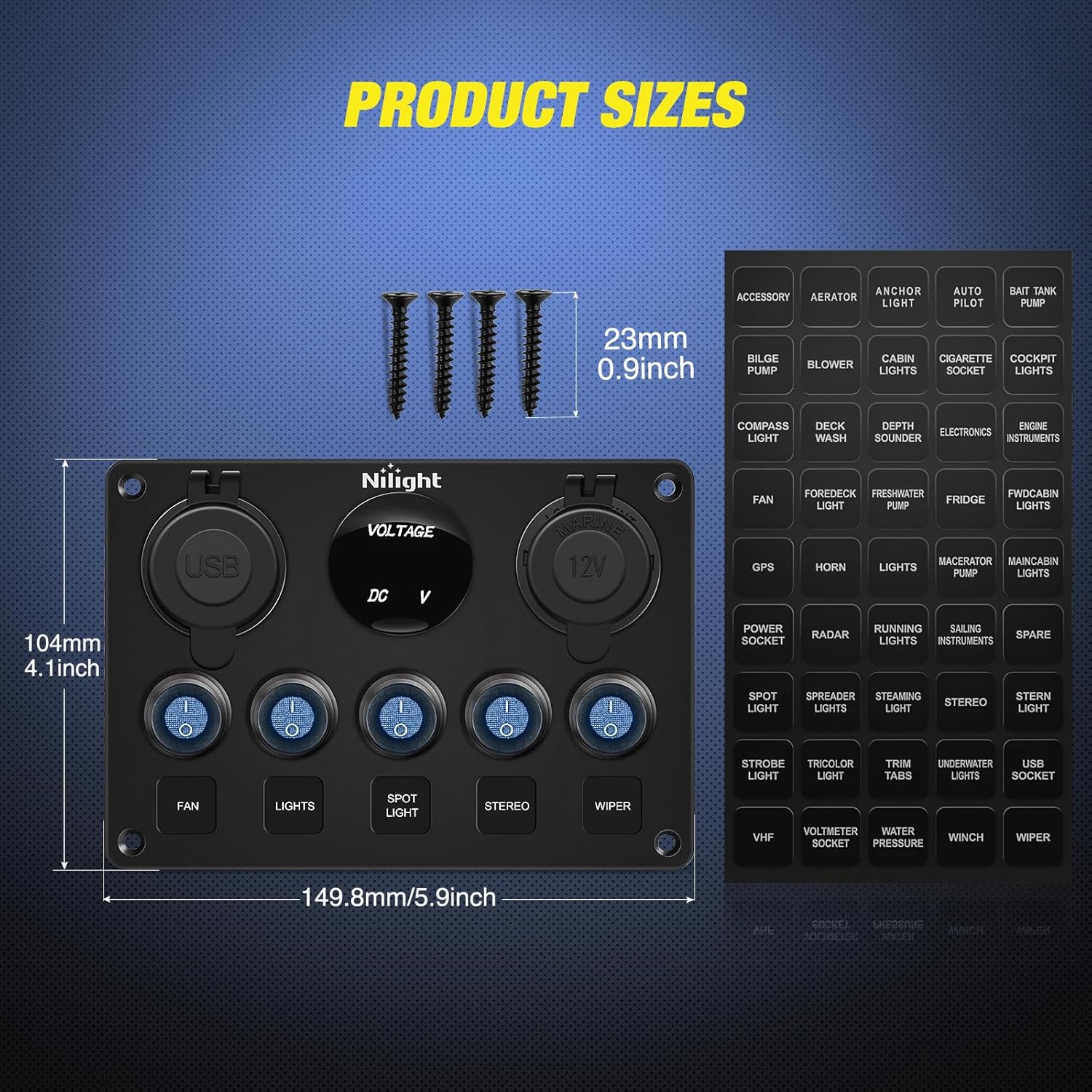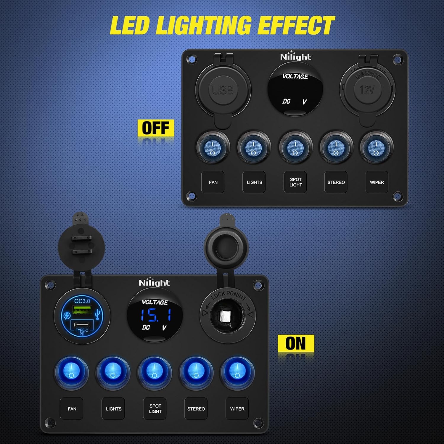 Nilight 5 Gang Multi Function Waterproof Switch Panel PD Type C and USB Charger Digital Voltmeter 12V Outlet Rocker with Inline Fuse for RVs Cars Boats Trucks Trailers